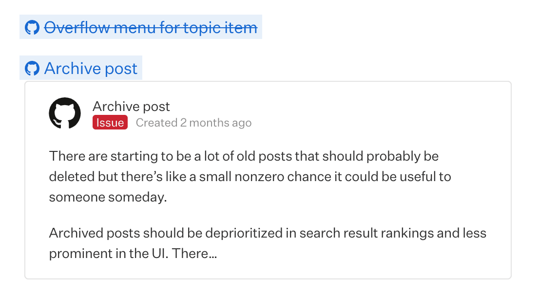 Stay on top of issues and pull requests with link unfurling. Hovering over the links will show more details, including the status, date created, assignee, and issue description!
