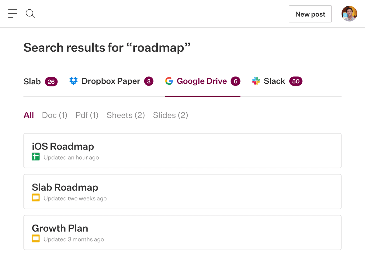 Looking for something in Drive? Find it in Slab with just a single click. Your entire Google Drive is searchable directly within Slab! You can even preview Drive results to see the content without needing to open them.