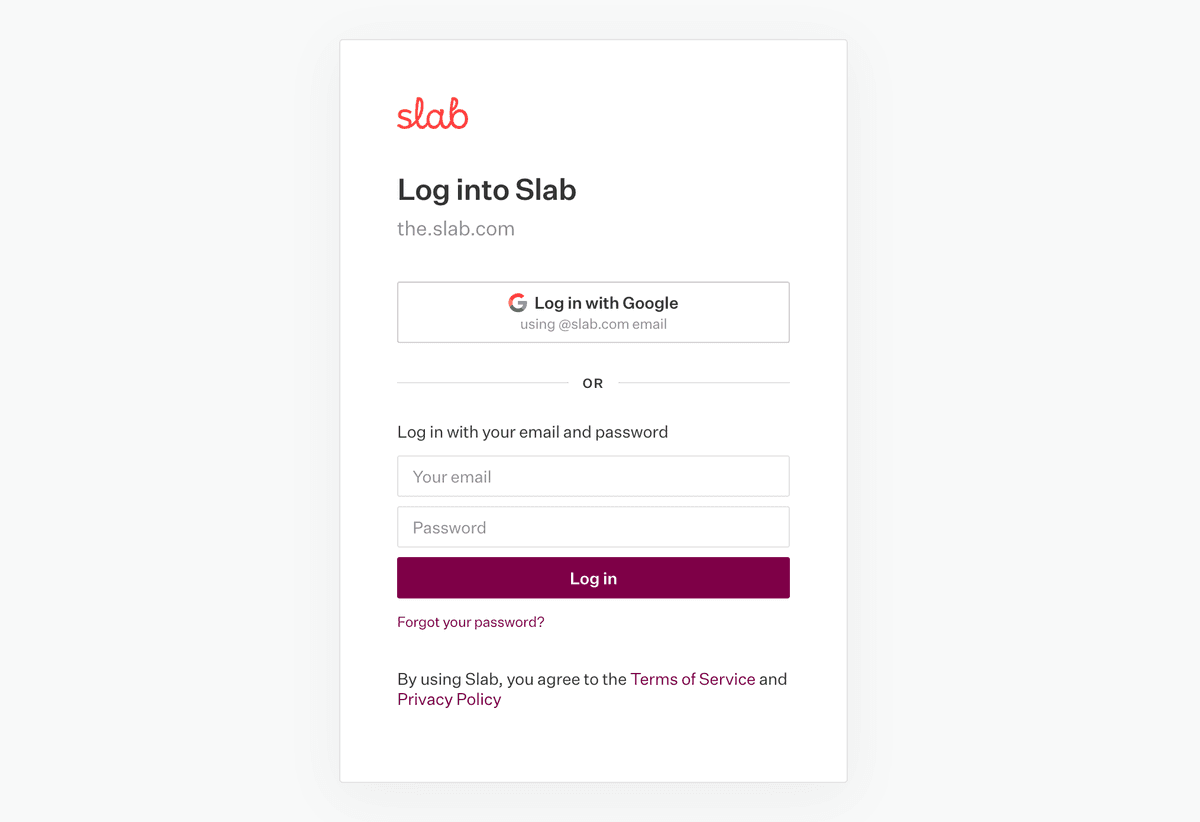 During the setup process or through the admin dashboard, you can enable or force Google Single Sign-On to give your entire team easy access to Slab.